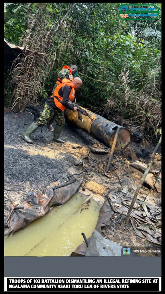 “In Rivers State, along the fringes of the Imo River, troops deactivated six illegal refining sites, destroyed fourteen drum pots and nine drum receivers, and confiscated over 8,000 litres of stolen products.