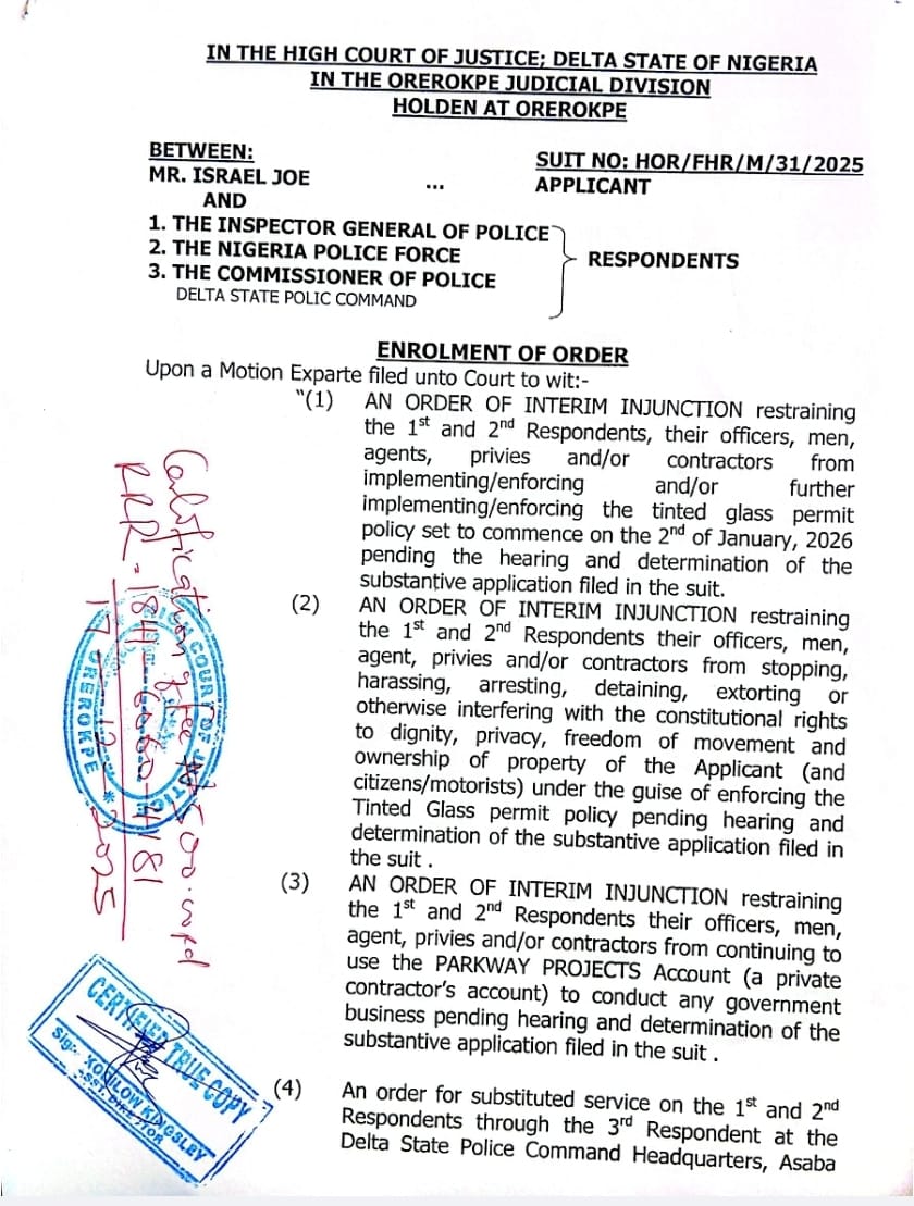 A Federal High Court sitting in Orerokpe, Delta State, has restrained the Nigeria Police Force from enforcing the tinted glass permit policy across the country, pending the determination of a substantive suit challenging its legality.