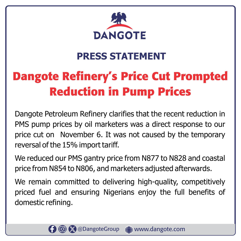 The Dangote Petroleum Refinery has issued a clarification stating that the recent reduction in Premium Motor Spirit (PMS, or petrol) pump prices by oil marketers was a direct response to the refinery’s price cut on November 6, and was not caused by the temporary reversal of the 15 percent import tariff.