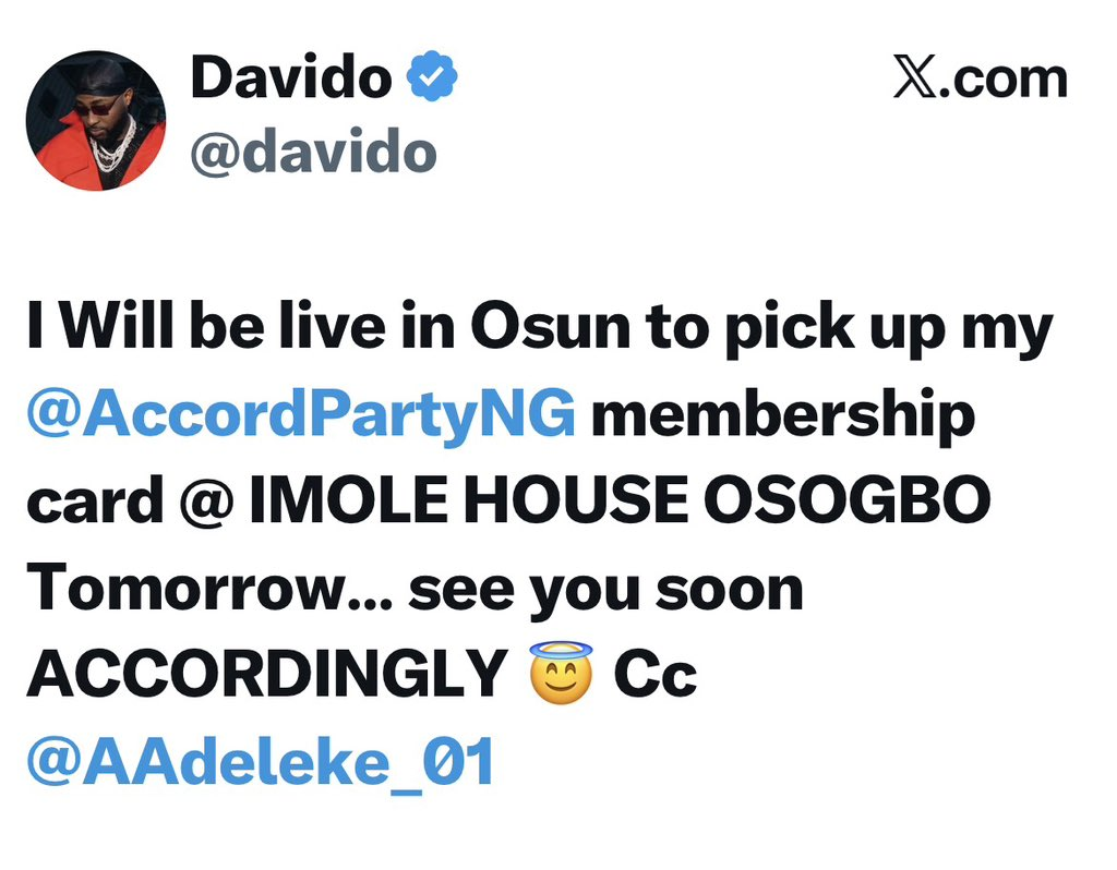 Davido disclosed his political intentions through his verified social media channels, stating that he would be visiting the Osun State capital, Osogbo, to officially collect his party membership card.