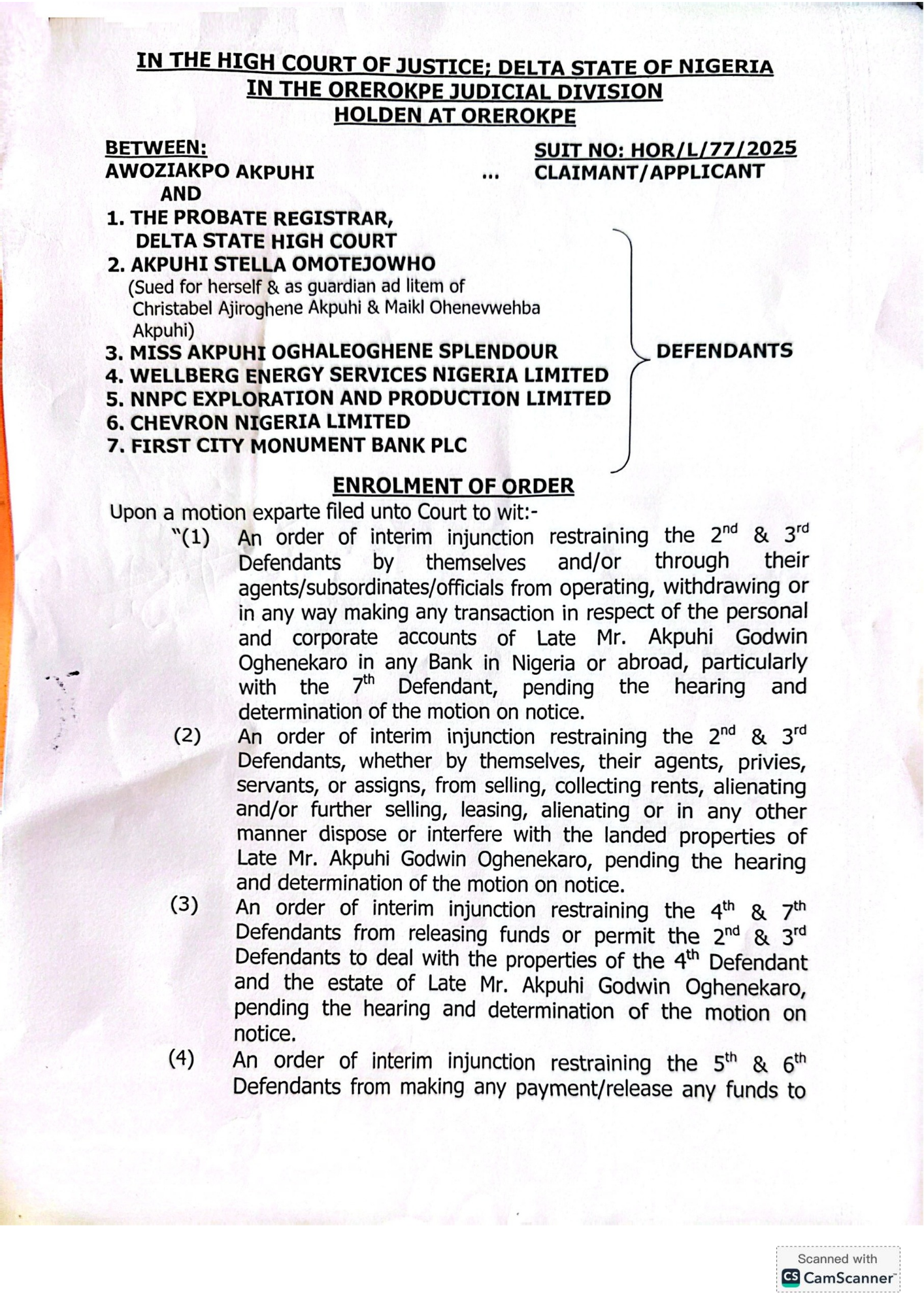 Other defendants include Miss Akpuhi Oghaleoghene Splendour, WellBerg Energy Service Nigeria Limited, NNPC Exploration and Production Limited, Chevron Nigeria Limited, and First City Monument Bank Plc.