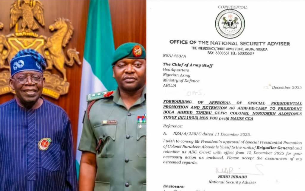 A significant controversy is brewing within the Nigerian Army following unconfirmed reports that President Bola Tinubu has approved the fast-track promotion of his Aide-de-Camp (ADC), Colonel Nurudeen Yusuf, to the rank of Brigadier-General. The alleged elevation, which bypasses conventional service requirements, has reportedly triggered widespread disquiet and accusations of favouritism among serving officers.