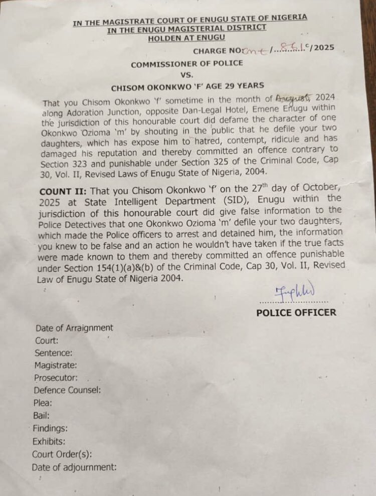 Consequently, having failed to substantiate her serious allegations, Chisom Okonkwo was found to have defamed her husband and provided false information to law enforcement. She was subsequently arraigned before the Magistrate Court of Enugu State on a two-count charge of defamation and giving false information. The court granted her bail, and the case was adjourned for further hearing.